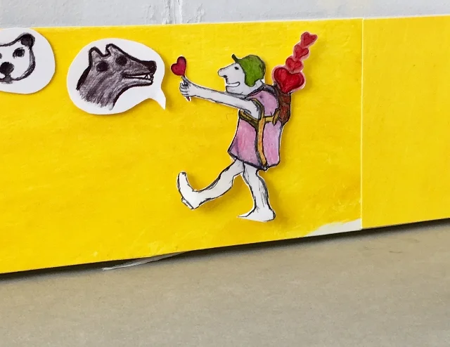 The colorful background together with the warmth of the artists characteristic style create a joyful atmosphere, that connects the different stories inside the space.