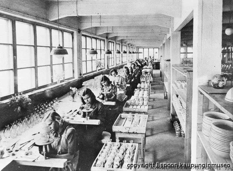 Lasihytti is known for glass manufacturing. Workers in the Kauklahti glass factory in 1948. Image: KAMU Espoo City Museum, Mauno Mannelin, CC BY-ND 4.0.